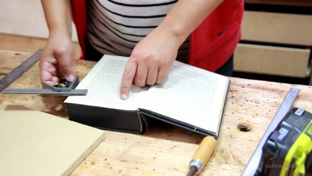 Технология такая: Берем кусок МДФ, чертим на нем размеры нашей ячейки тайника. Прикладываем кусок к книге и плотно прижимаем. И сверлим в углах МДФ с книгой. Предварительно перед сверлением, необходимо измерить толщину куска МДФ и толщину книги, вычесть 0,5-1 сантиметр. На получившееся расстояние делаем ограничитель на сверле, чтобы не просверлить книгу насквозь.