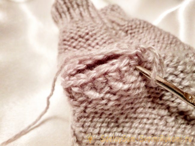 Можно вывязать большой палец до сшивания краев изделия.