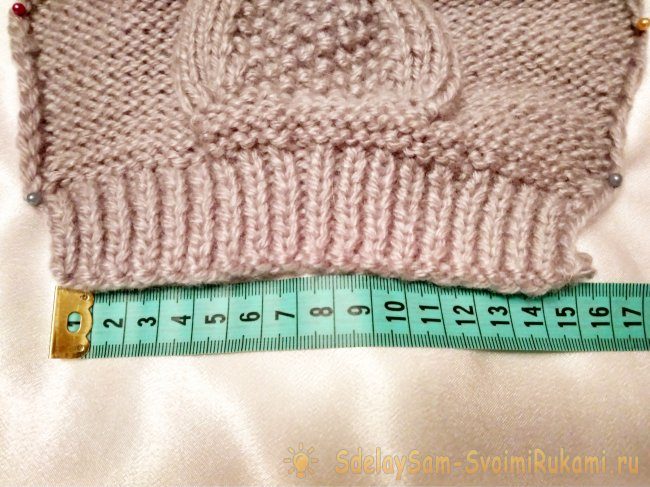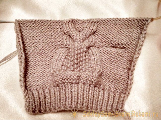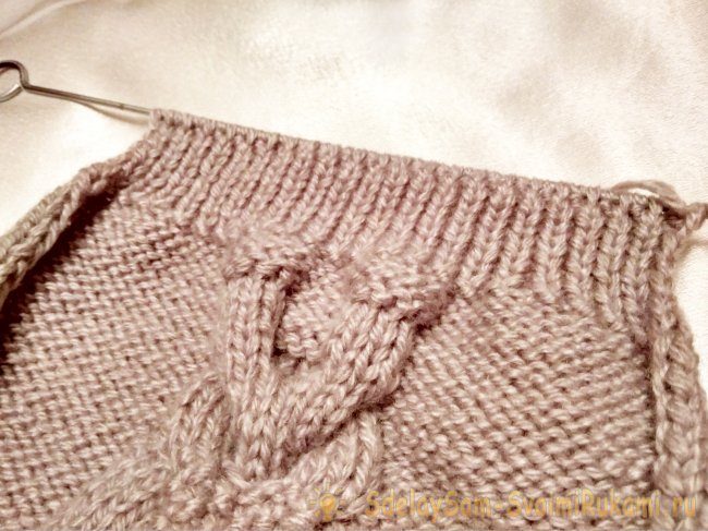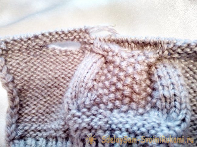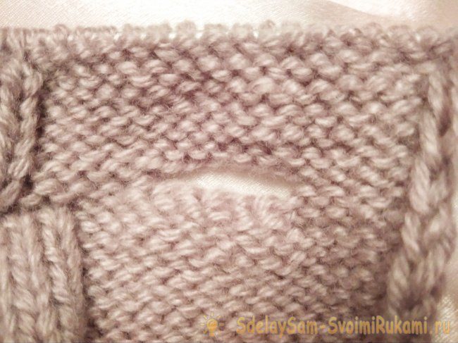 Для узора выделить 18 п. в середине имеющихся петель. Крайние петли продолжать вязать изнаночной гладью.