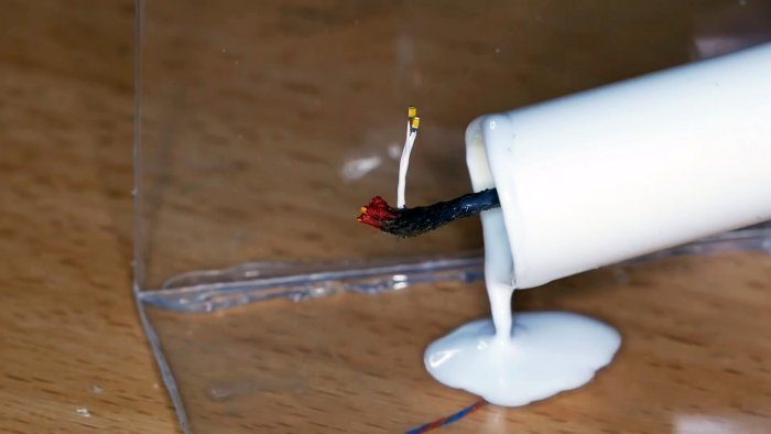 Далее нужно взять кусок шнура, обжечь его до копоти, пропитать суперклеем для жесткости и вклеить на свечку, чтобы сымитировать ее финтить. Шнурок вклеивается на провода светодиодов. В месте их примыкания провода подкрашиваются черной краской.