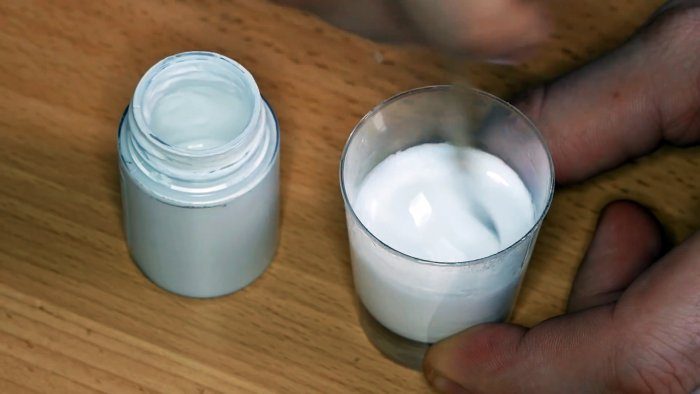 Далее замешивается смола с отвердителем и подкрашивается в белый цвет.