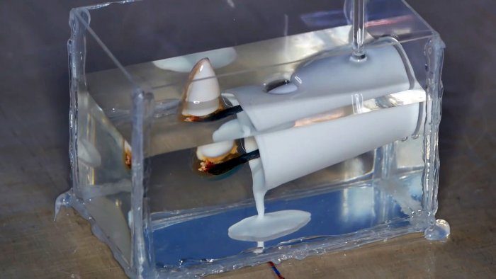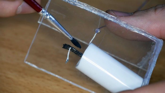 На заготовку снизу подливается подкрашенная в белое смола, чтобы убрать прозрачность. После этого собираются и вклеиваются к дну бортики под установку батарейки.