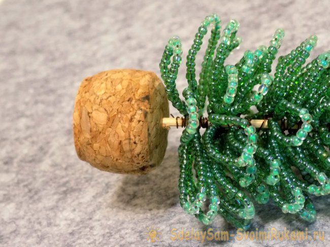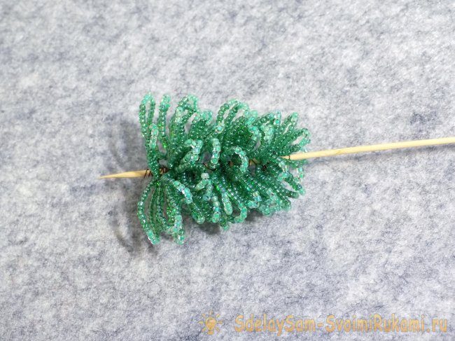 «Макушку» для елочки из бисера делаем из нескольких петель: 16- 5 – 16 (1 шт.); 12-5-12 (3 шт.). Каждую складываем пополам, и плотно прижимаем половинки друг к другу. Обрезаем деревянную шпажку, когда закончились все петельки. Приматываем к самому краю «макушку». Располагаем ее строго вертикально.