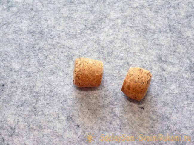 «Пенечек» для елочки сделаем из пробки от шампанского. Для этого достаточно ее просто разрезать пополам острым ножом. Срез делаем ровным, чтобы елочка была устойчивой.