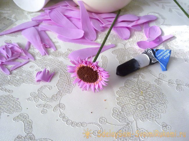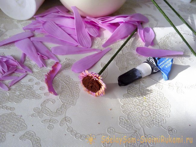 Следующие 10 лепестков приклеиваем между лепестками первого ряда. Оставшиеся лепесточки подклеиваем на своё усмотрение, заполняя свободные просветы.