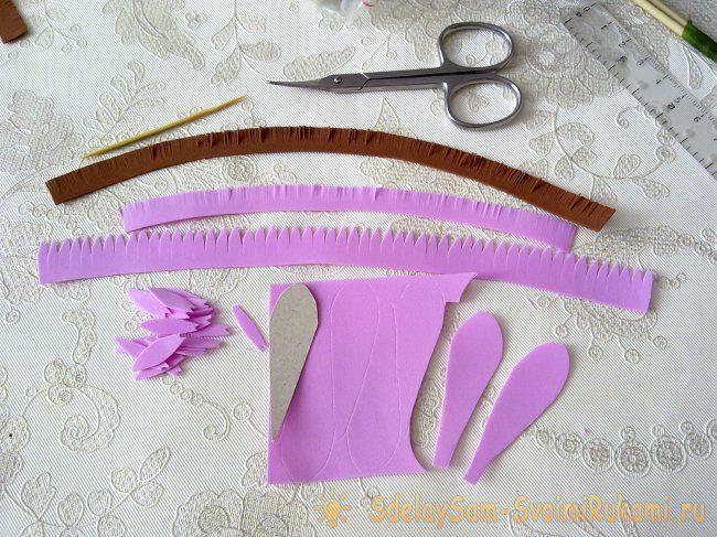 Выкраиваем из коричневого фоамирана полоску 1х20 см, превращаем её в бахрому.Из розового фоамирана выкраиваем одну полоску 1,3х15 см, нарезаем бахрому, как у коричневой. Вторую розовую полосу отрезаем чуть шире и длиннее — 1,5х18 см, нарезаем её зубцами. Не бойтесь сделать полоски длиннее, лишнее всегда можно отрезать. А вот если не хватит, то придётся выкраивать недостающую длину.