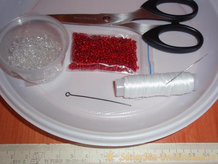 1. Берём штифт, нитки, иглу, линейку, ножницы, красный бисер, бесцветные бусинки по 5 мм и собираем двойную часть ожерелья.