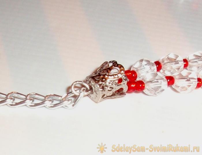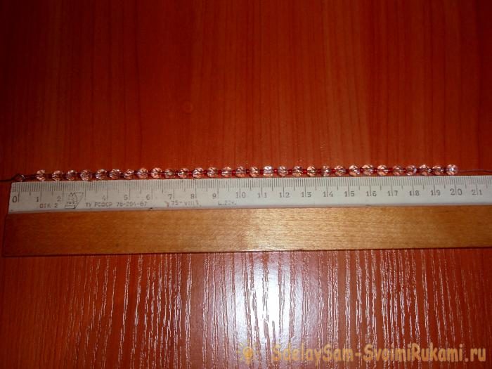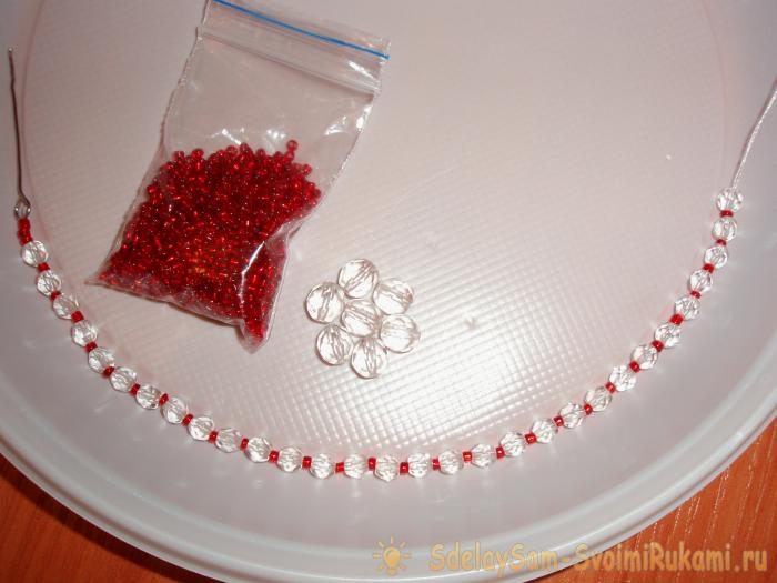 Набираем на нитку три красные бисеринки, затем чередуем бусины и бисер 1:1. После набора 30 штук бусин останавливаемся. Длина нити у нас получилась примерно 20 см.