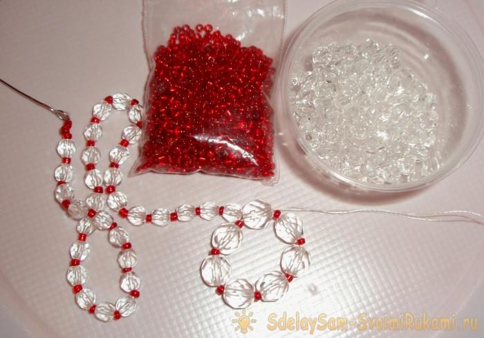 5. Берём прозрачный бесцветный бисер, красный бисер, стеклярус, красные бусины.