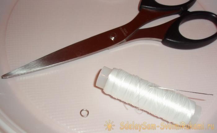 4. Берём нитки, иглу, ножницы и двойное соединительное кольцо.