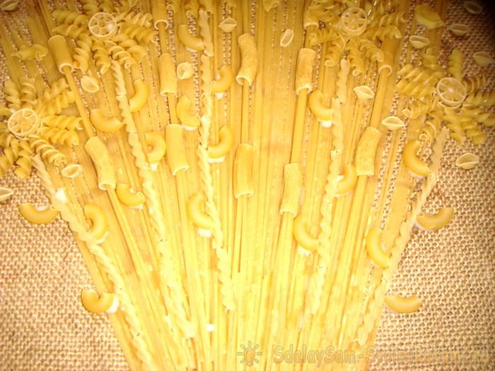 Теперь подберите разные по форме и размеру макаронные изделия. Вам обязательно пригодятся длинные спагетти, тонкие и толстые спиральки, ракушки, колесики, гребешки и рожки.