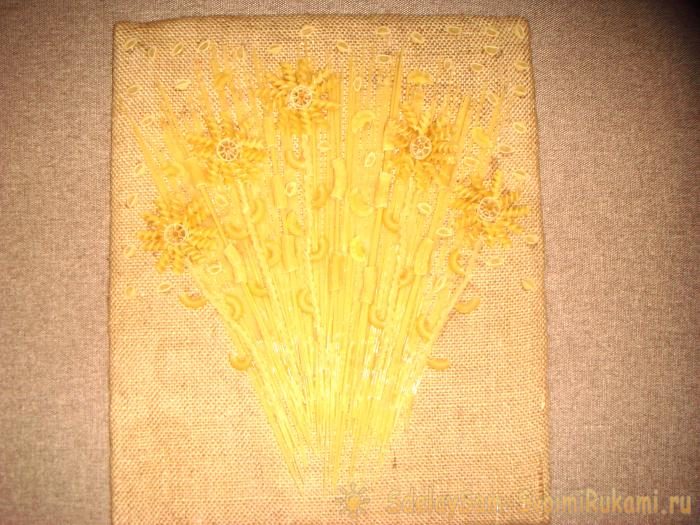Вот и все, картина из макаронных изделий готова. Получился пышный букет. После высыхания все элементы держатся на полотне надежно и прочно.