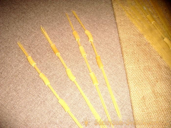 Потом возьмите 5 тонких длинных макаронин и наденьте на них по 2-3 рожка.