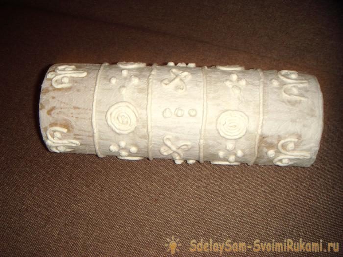 Дальше приступайте к нанесению рельефного узора. Его удобно делать из жгутиков, скрученных из бумажных салфеток.