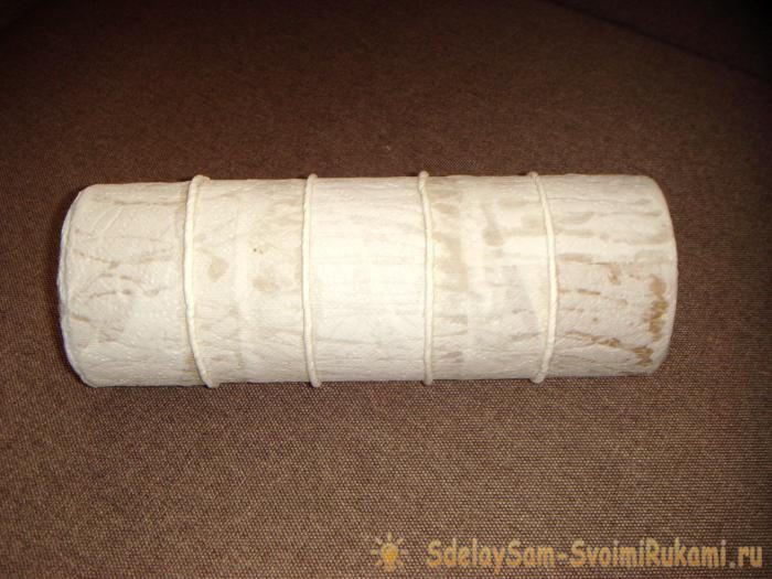 — оклеить бобины можно однотонной тканью, яркой оберточной бумагой или обычной мешковиной;