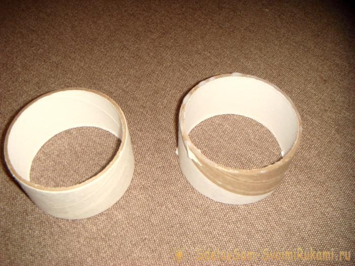 Возьмите первое картонное кольцо. Нанесите слой клея ПВА на один из его торцов и приклейте к нему второе кольцо.