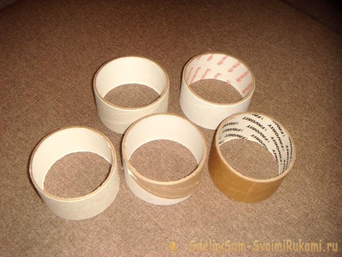 Возьмите 5 бобин от скотча. Проследите, чтобы все они были одинаковой высоты и диаметра.