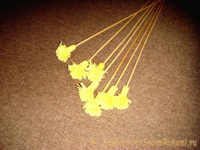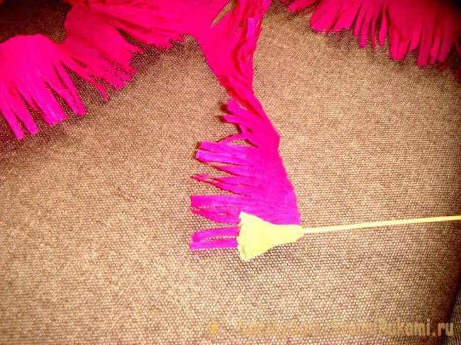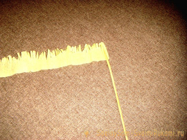 Для этого возьмите одну деревянную палочку и приложите ее к краю желтой полосочки. Бахрома должна находиться выше края шпажки.