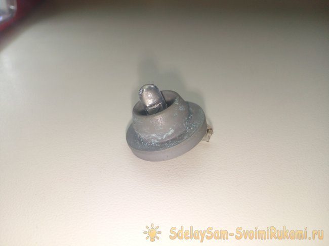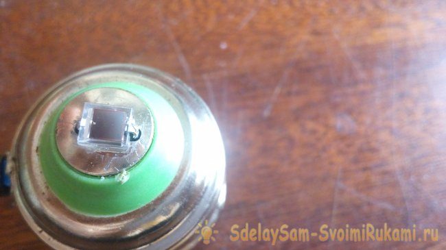 В верхней части цоколя сверлим два отверстия под ножки фотодиода. Их надо удлинить примерно на сантиметр. Затем капаем чуть суперклея и крепим фотодиод.