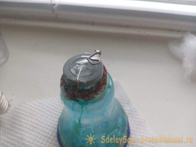 И заливаем его раствором жидкого стекла. Когда будете заливать, капните чуть-чуть раствора на крышку, он засохнет и добавит устойчивости всей конструкции. Химический процесс начался, уже через несколько минут начнут образовываться первые водоросли.