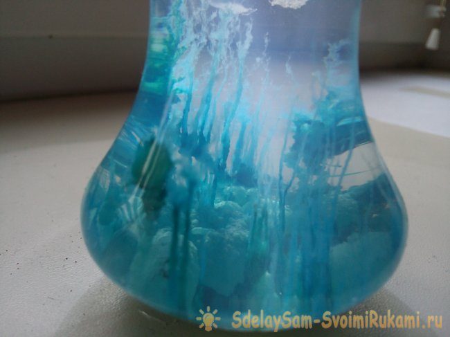 Вместо медного купороса можно использовать железный купорос (тоже удобрение) или сульфат магния (продается в аптеке, это порошок, чтобы из него выросли водоросли, его надо предварительно смочить небольшим количеством воды и дать ей испариться, благодаря этому мы увеличим размер кристаллов, ведь чем они крупнее, тем выше будут водоросли). От реактива зависит цвет химических водорослей: железный купорос даёт черный цвет, сульфат магния – белый, медный купорос – приятно голубой.