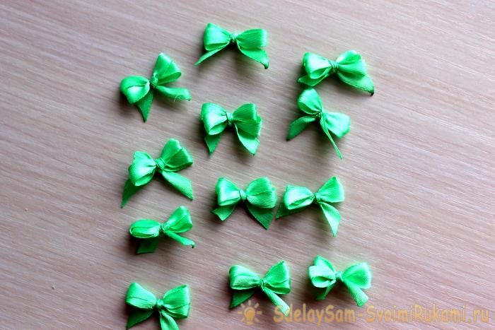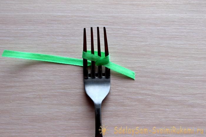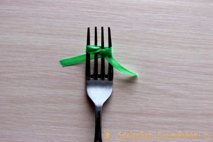 Из узкой зеленой ленточки сделайте маленькие бантики. Удобнее всего это сделать на вилке, повторяя действия, показанные на фото.