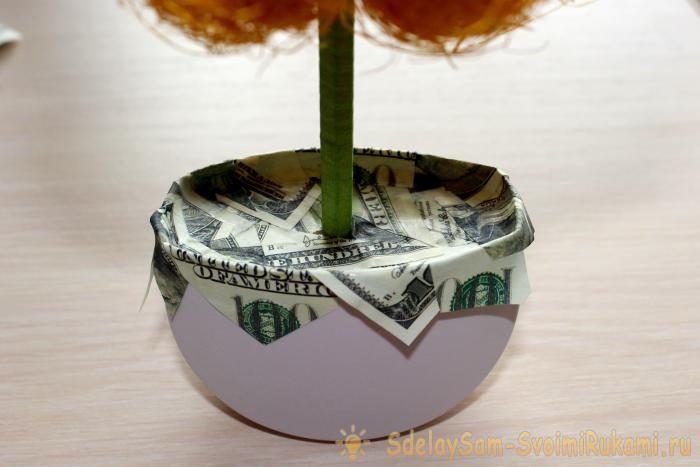 Топиарий можно оставить в таком виде или украсить деньгами, причем как настоящими, так и фальшивыми.