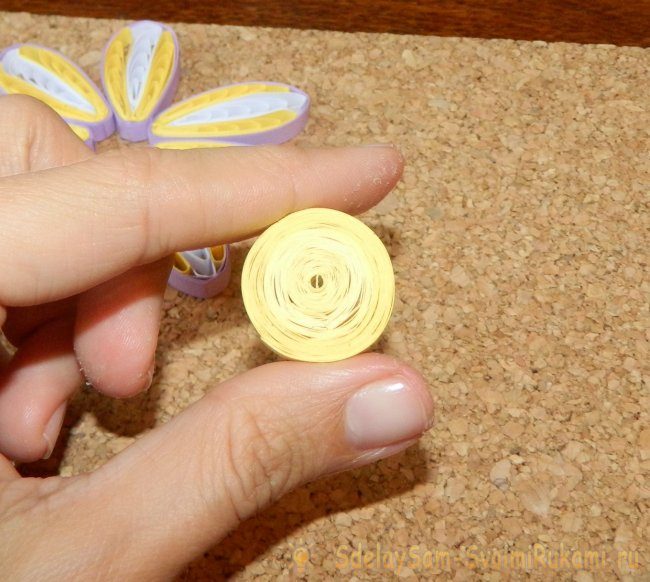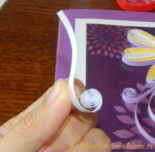 Далее берем полоску фиолетовой бумаги 20 см в длину, сгибаем пополам. Края полоски фиксируем клеем, затем начинаем накручивать инструментом. Полученную деталь смазываем небольшим слоем клея, фиксируем на основе.