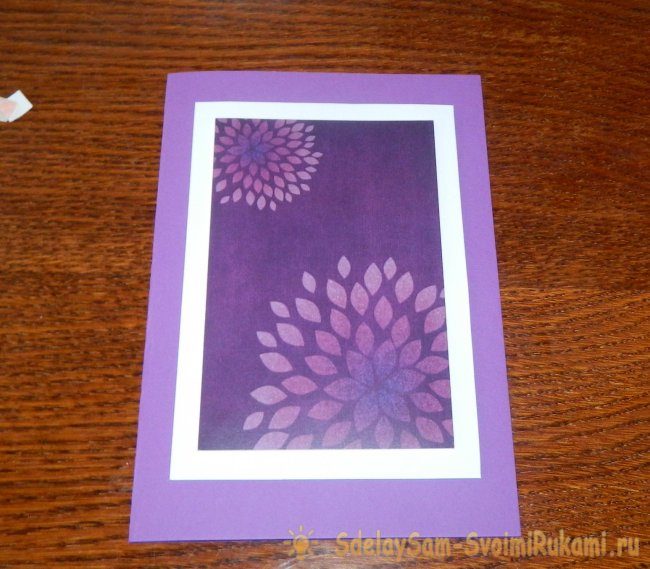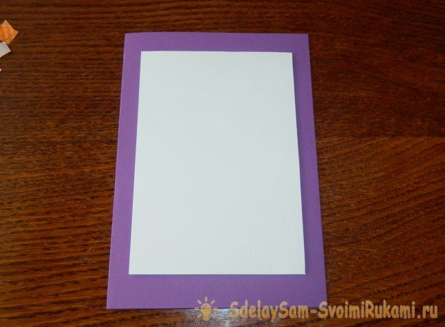 Размеры фиолетовой дизайнерской бумаги 10х15 см. Ее также оклеиваем с обратной стороны вспененным скотчем двусторонним и крепим сверху на белый прямоугольник на основе.