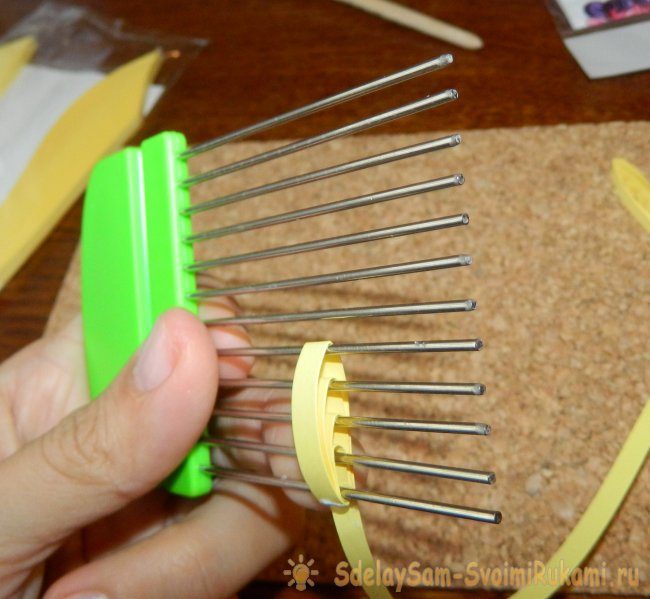 Берем желтую бумагу для квиллинга 20 см и с помощью инструмента «гребешка» начинаем формировать деталь. Крепим конец полоски бумаги на гребешок.