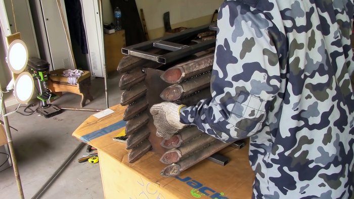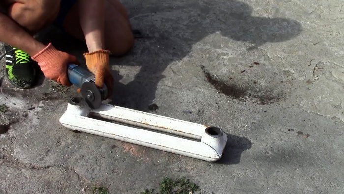 Для изготовления боковин печки нужно разобрать радиатор на секции. Чтобы не искать ключи и не выкручивать ржавые ниппеля батарею можно просто порезать на секции болгаркой.