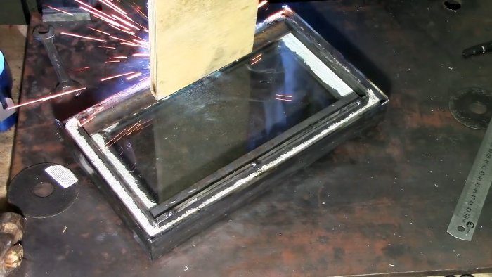 Далее из профильной трубы сваривается дверца топки. Чтобы она плотно прилегала, ее толщину нужно нарастить стальной полосой. Один ее ряд приваривается по периметру дверцы, а второй с отступом на 10 мм. В результате получится 2 стенки, между которыми укладывается асбестовый шнур.