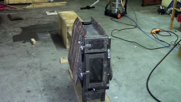 Затем из ребер свариваются 2 боковые стенки для печки. Для буржуйки будет достаточно использования на стенку по 7-8 ребер. Сваривать необходимо сплошным швом, добившись полной герметичности.