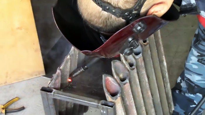 Перевернув печку набок нужно заварить зазор между скошенными стенками из батареи и ровными нижними боковинами из листовой стали. Для этого вырезаются вставки соответствующего размера и герметично ввариваются.