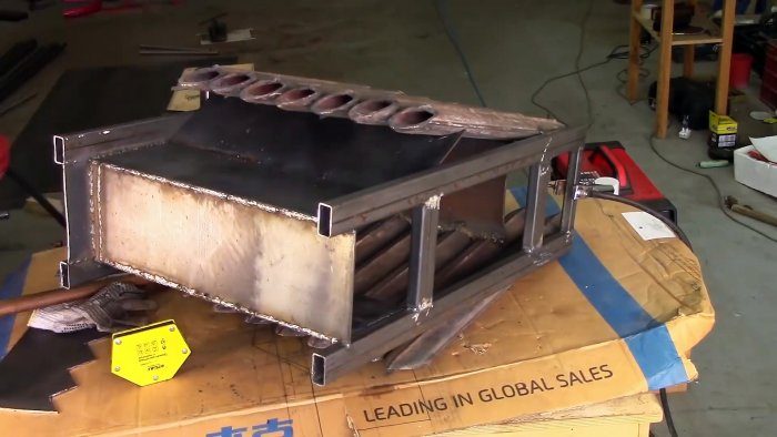 Каркас задней стенки делается П-образным. Причем он должен быть лишь немного выше отдела для зольника, отведенного по проему в передней стенке. Поперечная трубка каркаса делается шире, при этом вертикали должны привариваться так же, как и впереди. Затем проем между трубками заваривается листовой сталью.