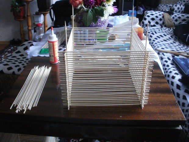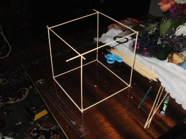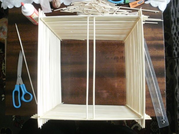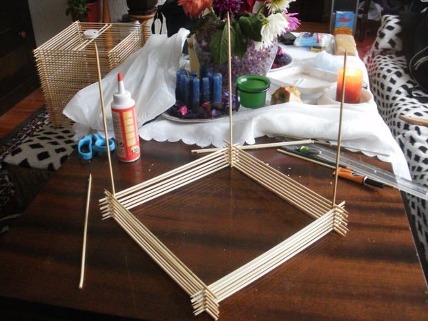 Итак, возьмем шпажки и склеим ровный квадратный каркас. Он задает всю форму светильника, поэтому его нужно склеить особо ровно.Этот каркас склеен из тех же шпажек, обрезанных на 2 сантиметра, чтобы боковые палочки выпирали, задавая необычную форму светильника.
