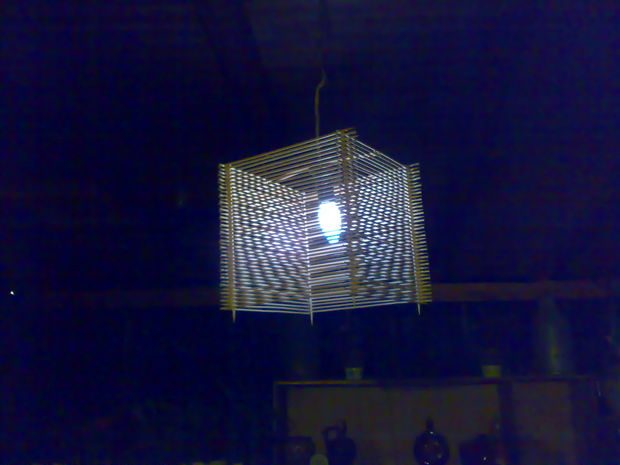 Все что вам понадобиться это бамбуковые (деревянные) шпажки, которые можно купить в кулинарных магазинах. И клей по дереву, типа ПВА. Ну лампочку с проводом я в расчет не беру.