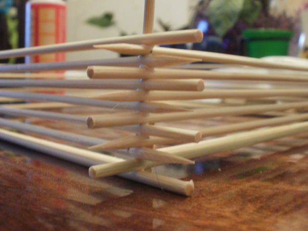 Этот каркас склеен из тех же шпажек, обрезанных на 2 сантиметра, чтобы боковые палочки выпирали, задавая необычную форму светильника.