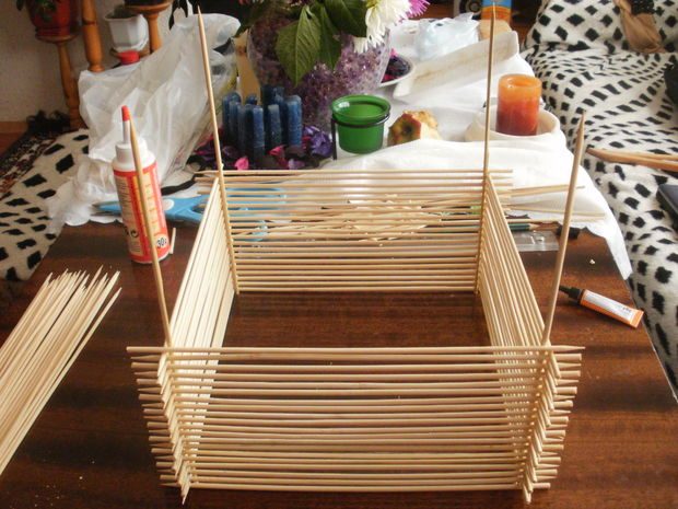 Тем же клеем начинаем приклеивать палочки. Сначала одну палочку с одной стороны, потом вторую с противоположной. А третью и четвертую с боковых. Палочки ложатся друг на друга.