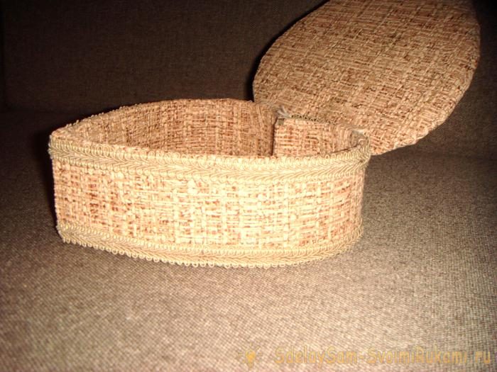 Остается только задекорировать поделку. Сверху и снизу на боковой части приклейте тесьму в тон обоев.