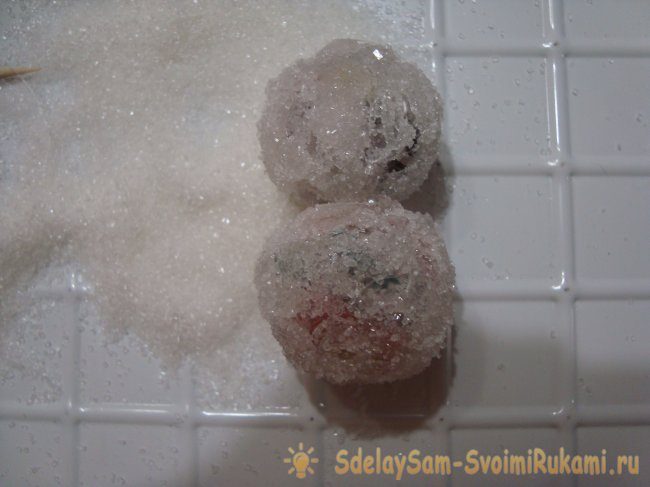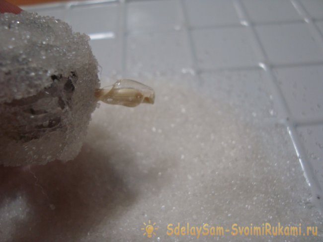 Шаг 3. Теперь начинается самая интересная часть. Для этого нам понадобится сахар. Зубочисткой проколем наш самый маленький шарик. Необходимо, чтобы он был плотно насажен на зубочистку. Это сделаем для того, чтобы нам было удобно его держать. Нанесем клей на весь шарик, это можно будет сделать при помощи клеевого пистолета или клея Момент. Далее обваляем шарик в сахаре, это создаст эффект, что снеговик сделан из снега.