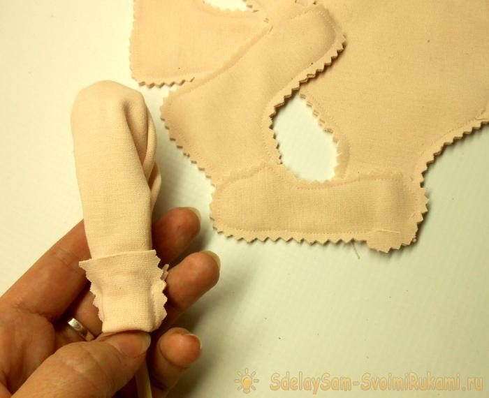 На противоположной стороне делаем углубление в наполнителе, куда и проталкиваем трикотажный «отросток».