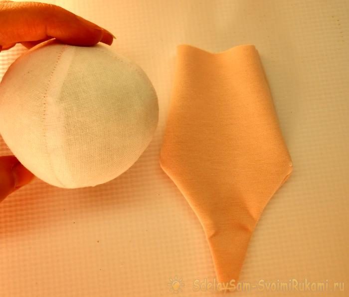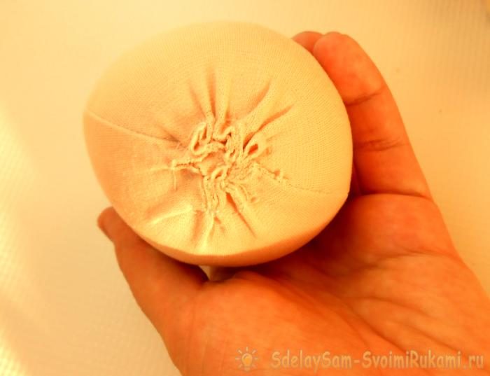 На сшитый из клиньев и плотно набитый наполнителем шар надеваем обтяжку, верхушку стягиваем.