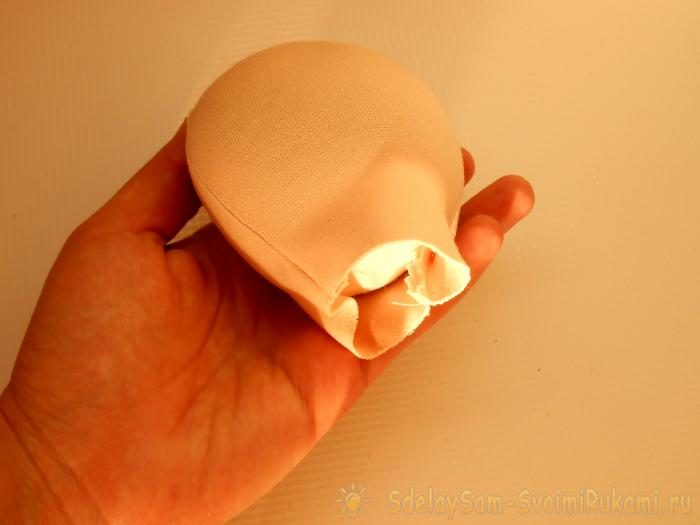 В это отверстие вставляем шею. Для фиксации можно капнуть на нее немного клея «Момент» или зафиксировать ниткой, соединив с макушкой головы. Стык шеи с головой соединяем потайным швом.