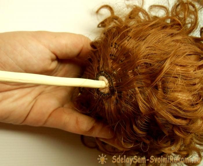 Сначала можно зафиксировать волосики на клей «Момент», а для надежности еще и пришить. Из оставшегося кусочка трессов длиной 8-10 см формируем пучок, его вставляем в небольшое отверстие на макушке.