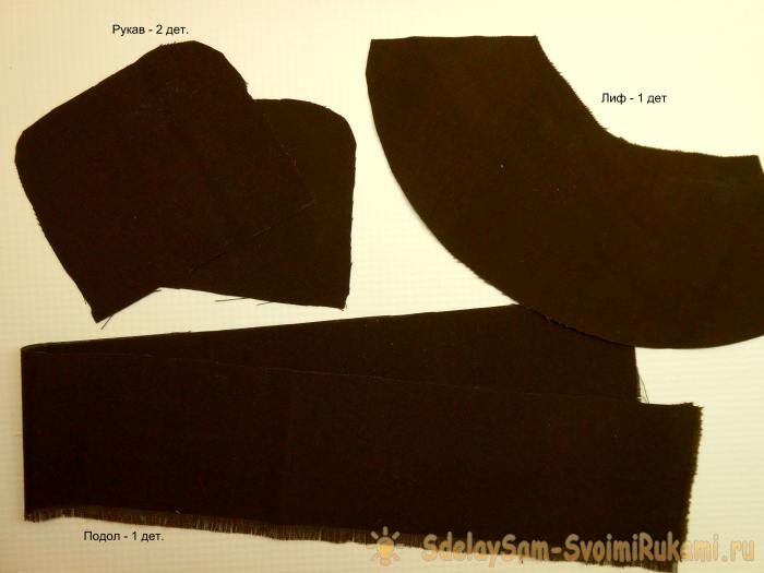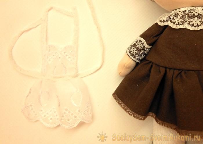 Далее шьем для куколки школьную форму. Так как будущая «первоклашка» у нас будет все-таки не игровая, а в большей степени интерьерная, то и платье у нее будет несъемное. Необходимо всего четыре детали – два рукавчика, лиф и подол.