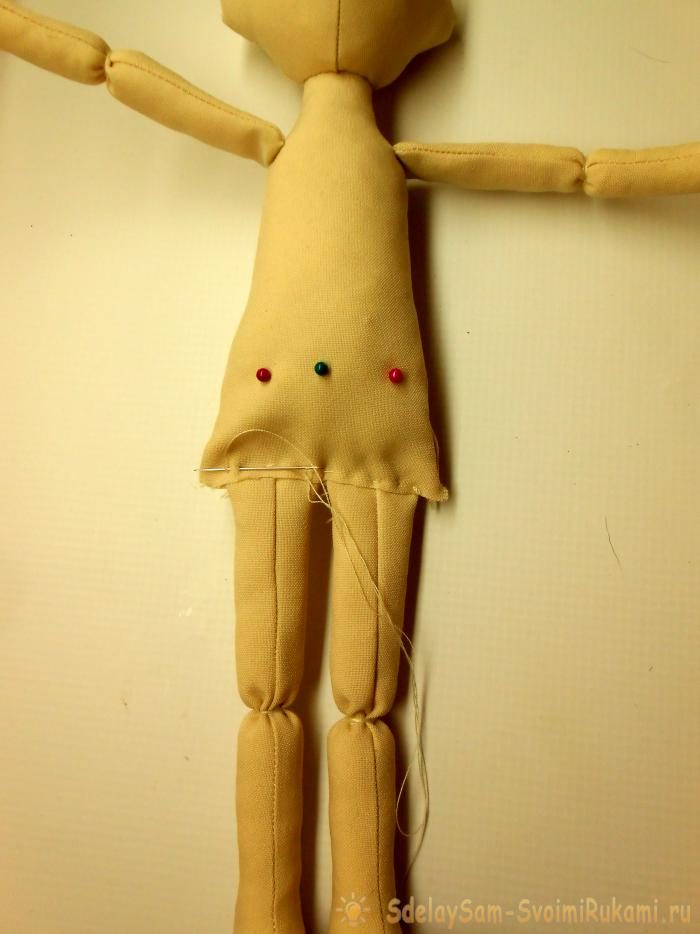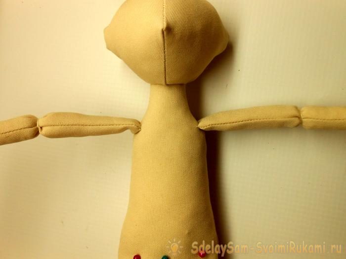 После наполнения тельца фиксируем его булавками, но пока не зашиваем. Стоит заметить, что шея должна быть очень плотной. Надеваем на нее еще не заполненную синтепоном заготовку головы, выравниваем положение и пришиваем потайным швом. Затем через затылок заполняем голову. Она должна быть также очень плотной.