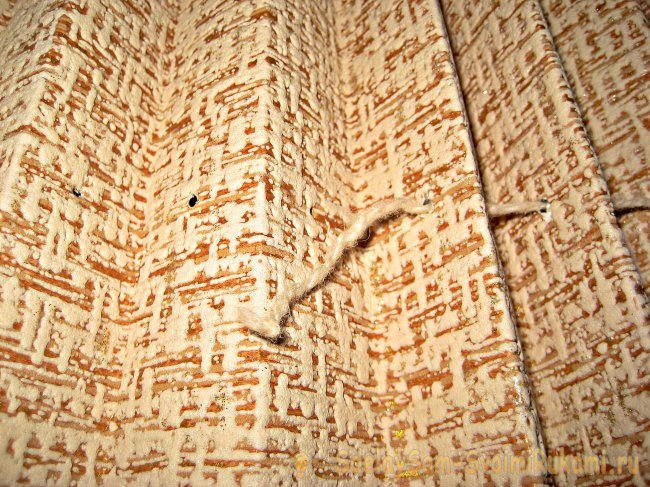 Сверху край нитки завязываем в узелок. Она должна хорошо фиксироваться на обоях.