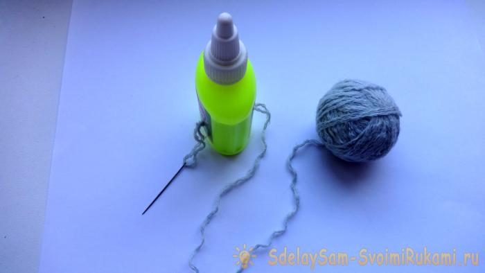 3. Далее вводим нитку в ушко иголки и протыкаем флакон с клеем ПВА, примерно посередине, таким образом, чтобы нитка пряжи, проходя через него, намокала.
