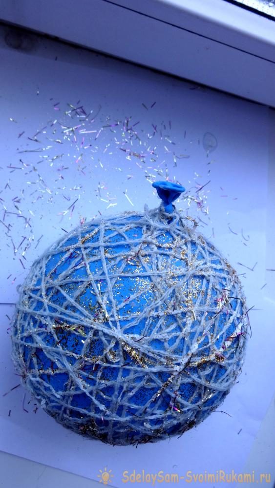 5. Пока нитки не высохли нужно посыпать шарик блёстками, которые можно сделать и самим из мишуры или дождика. Но можно обойтись и без этого. Мы же с сыночком решили посыпать, чтобы наш ёлочный шарик был поярче и покрасивее.